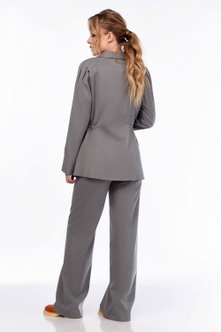 Элегантный костюм, состоит из жакета и брюк, жакет полуприлегающего силуэта, с двубортной застежкой на петли и пуговицы, рельефными швами. Воротник-шаль, рукав реглан со складками сверху. В области талии отрезная кулиска, в которую вставляется резинка. Длина ниже линии бедер, на подкладке. Брюки палаццо, на поясе на резинке без застежки, карманы в боковых швах.